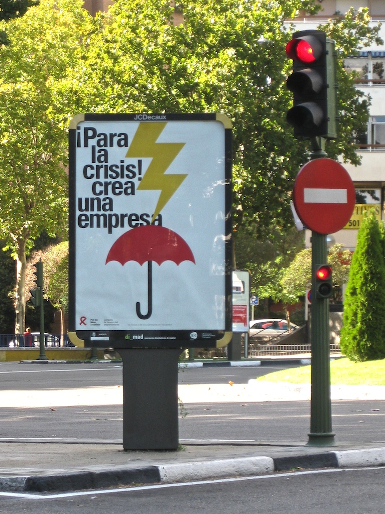 The poster, for those that aren’t yet amazing at Spanish, reads, “Stop The Crisis, Start A Company”!